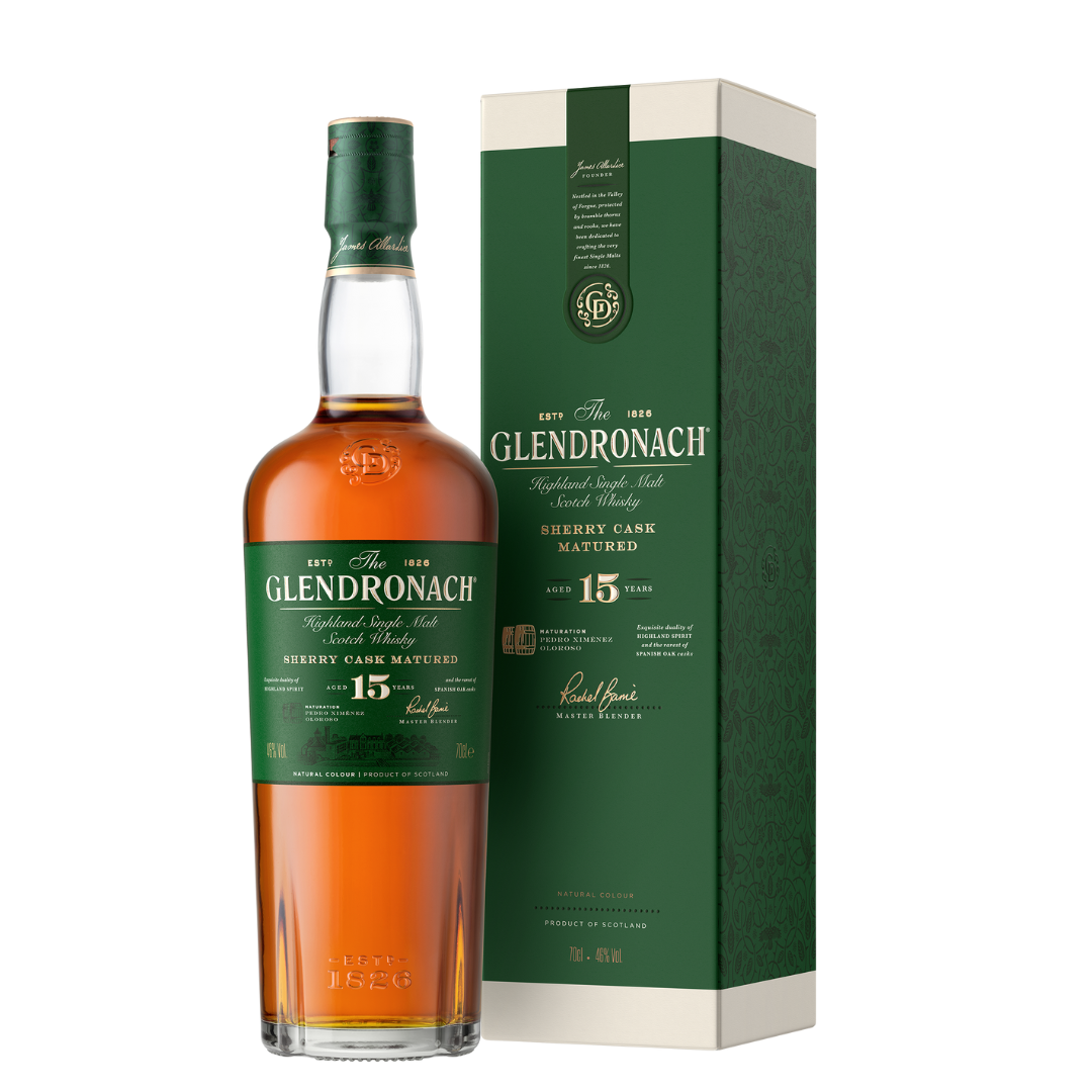 Deze verfijnde Single Malt rijpte maar liefst 15 jaar lang in ex-Oloroso en ex-Pedro-Ximénez sherryvaten. Deze whisky met een antiek koperen kleur toont elegantie en finesse en vertegenwoordigt de verfijnde smaak van The Glendronach subliem.